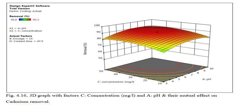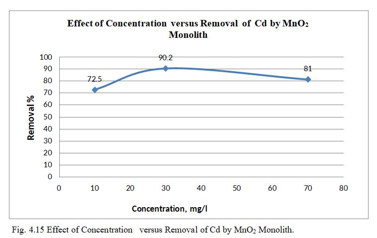 Fig.4.15 illustrates removal of Cd by MnO2 monolith of 90.98% at concentration of 30mg/l. Fig.4.16, 3D graph showingmutualeffectofparametersatoptimumdosageof 15mg,andpHof6.5.Theabovegraphsshowthatadsorption increaseswithincreasedleadionconcentrationupto30mg/l. With increase in Cadmium ion concentration, the removal efficiencydecreasesduetolessactivesitesandsurfacearea.