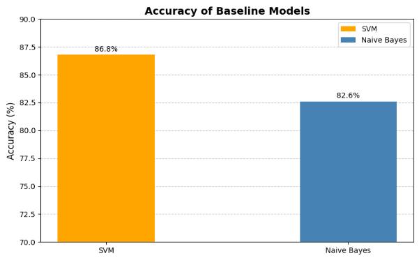 Table 1 presents the performance metrics for the baseline models, Support Vector Machine (SVM) and Naive Bayes, which were implemented to evaluate the initial effectiveness of traditional machine learning techniques in detecting fake news. The SVM model achieved an accuracy of 86.8%, with a precision of 0.84 andrecall of0.83,indicatinga strongabilitytocorrectly identify bothreal andfakenewsarticles.Incomparison, the Naive Bayes model, while effective, demonstrated slightly lower performance, with an accuracy of 82.6%, precision of 0.78, and recall of 0.76. These results highlight the solid performance of SVM as a baseline for fake news detection, though they also emphasize the potential for improvement through the use of more advancedNLPmodelsandensemblemethods.