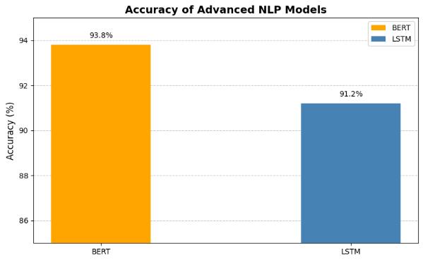 The advanced NLP models, BERT and LSTM, were evaluated on accuracy, precision, and recall. From Table 2 it is evident that BERT outperformed LSTM, achieving an accuracy of 93.8%, precision of 0.92, and recall of 0.92, showcasing its strong ability to capture contextual relationshipsintext.LSTM,whilestilleffective,achieved slightly lower results with an accuracy of 91.2%, precisionof0.88,andrecallof0.88,indicatingitsrelative difficultyinhandlinglong-rangedependenciescompared toBERT.