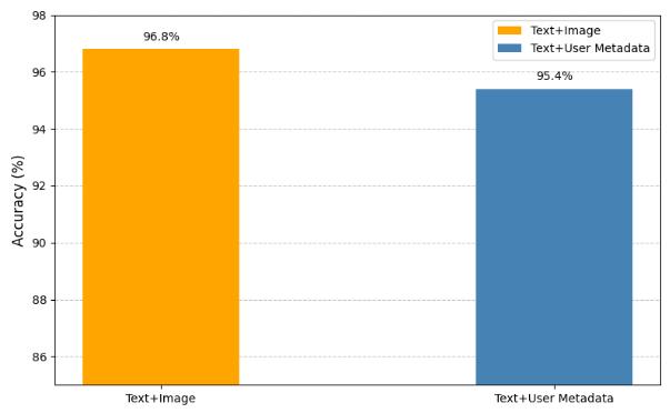 metadata also showed strong performance, with an accuracy of 95.4%. These results highlight the effectiveness of utilizing multimodal data, including image captions and user metadata, to improve classification accuracy and strengthen the robustness of fakenewsdetection.