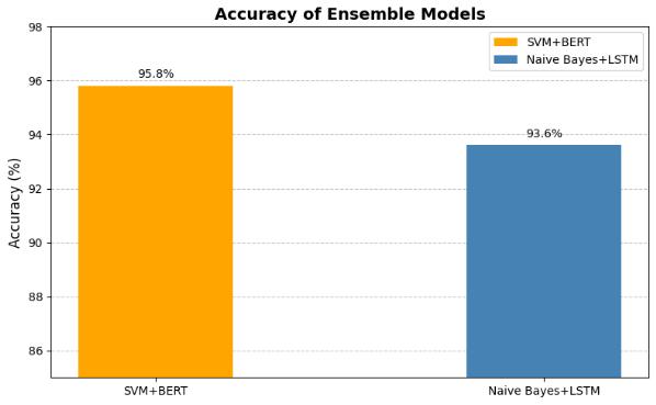 Table 3 presents the performance of the ensemble models, the combination of SVM and BERT achieved the highest accuracy of 95.8% This indicates strong performanceinbothcorrectlyidentifyingfakenewsand minimizing false positives. On the other hand, the Naive Bayes and LSTM ensemble achieved an accuracy of 93.6% These findings highlight the effectiveness of combining traditional and advanced models for fake newsdetection.