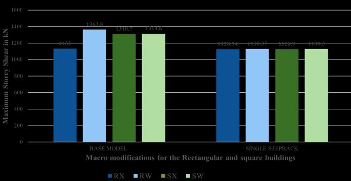Thesinglesetbackreducedstoreyshearinallcases compared to the base model. The reduction was most significant in the rectangular Y-direction. Overall, setbacksprovideabalancedwaytolowershearforces alongwithdisplacementanddrift.