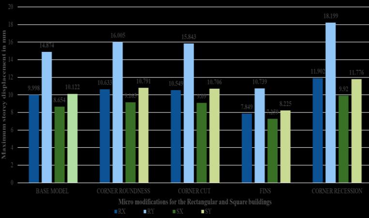 Chart -1:ComparisonofMaximumStoreydisplacement forrectangularbuildingandsquarebuildingsofMicro Modification