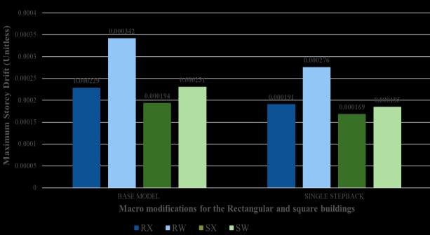 Chart-4:ComparisonofMaximumStoreydriftfor rectangularbuildingandsquarebuildingsforMacro Modification