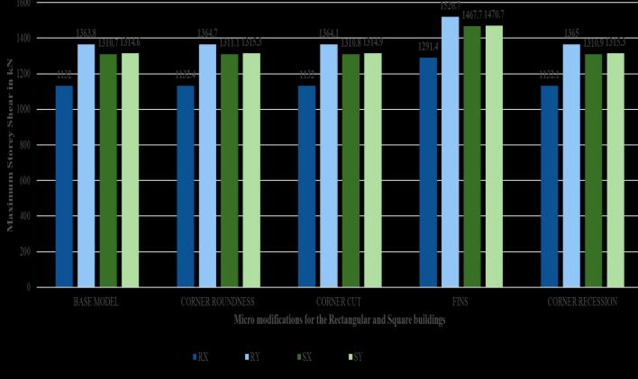Chart-5:ComparisonofMaximumStoreyshearfor rectangularbuildingandsquarebuildingsforMicro Modification