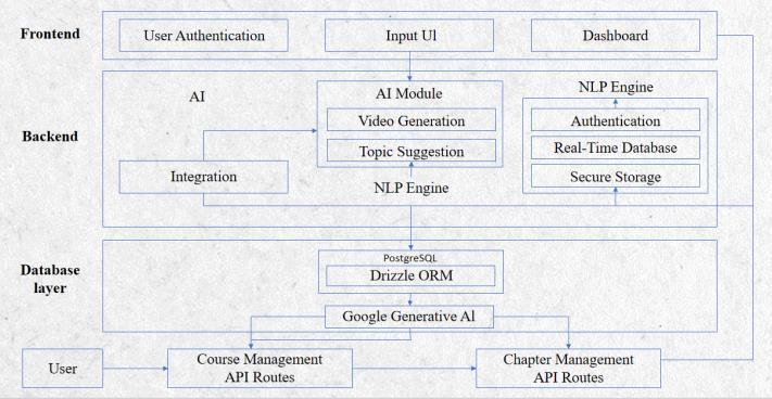 Built using Next.js 15, React 19, and Tailwind CSS on the frontend, and powered by Neon Serverless PostgreSQL with Drizzle ORM on the backend, the framework ensures seamless data handling, improved responsiveness, and scalable performance. Authentication is managed through Clerk, enabling secure and personalized user access. The system employs a modular architecture consisting of course-creation APIs, chapter-generation pipelines, and a dynamic dashboard for course management. Experimental evaluation demonstrates that the proposed solution reduces manual course creation time by over 80%, enhances consistency incontentstructure, andsignificantly increases the volume and diversity of educational material generatedwithinagiventimeframe.