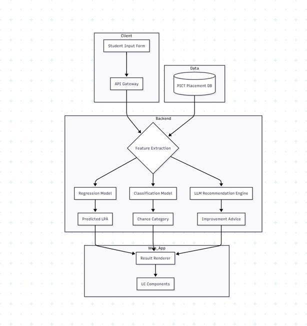 The proposed system focuses on predicting placement chances and recommending personalized improvementstrategiesforstudentsatPICT.Theworkflow begins with data collection, where historical placement records and student performance details such as CGPA, AMCATscores,subjectgrades,backloghistory,andcoding profilesaregatheredfrominstitutionalrecords.Afterdata collection, preprocessing steps are performed, including handling missing values, normalization of numerical attributes, encoding categorical variables, and removal of outliers. The cleaned dataset is then divided into training andtestingsubsets.