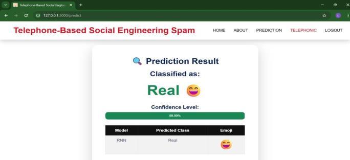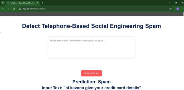 ThesystemwassuccessfullydeployedasaFlask-basedweb application, offering users an accessible platform to input messages or upload voice recordings for real-time classification. The application demonstrated strong responsivenessandusability,withpredictiontimesunder three seconds and a clear, user-friendly interface. This confirmsthefeasibilityofdeployingsuchasysteminrealworldenvironmentslikecallcentres,banking,government, andtelecomsectors.