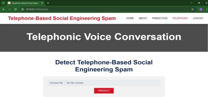 Toprovideseamlessinteractionforend-users,bothmodules areintegratedintoaunifiedwebapplicationusingtheFlask framework. The web interface offers two primary functionalities:1)textinputboxformessageclassification, and 2) file upload form for voice classification. Upon submission, the Flask backend routes the request to the appropriate model. For text messages, the input is preprocessed, vectorized with TF-IDF, and fed into the serialized ML model to return a prediction label and confidencescore.Foraudio files,MFCCsare extracted onthe-fly,andthecorrespondingdeeplearningmodelclassifies theinputaseitherRealorFake,alsodisplayingaconfidence level. Users can listen to the uploaded audio through an integratedaudioplaybackfeature.
