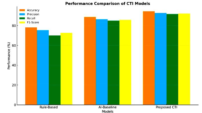 TheresearchdemonstratesthatanAI-driven,integratedCTI systemsignificantlyenhancescybersecuritycapabilitiesby providing accurate, interpretable, and actionable intelligence.Byleveragingmachinelearning,dataanalytics,