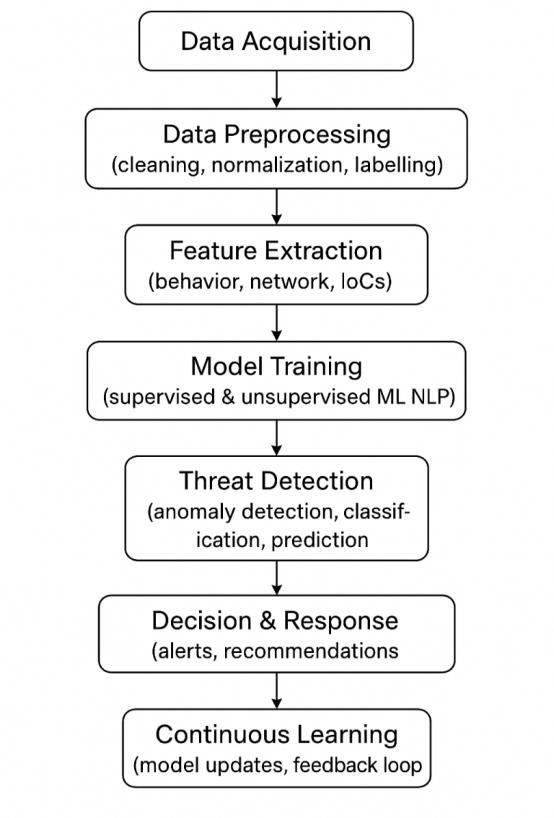 The proposed model aims to address these gaps by developingan integrated,AI-drivenCTIsystemthatunifies multi-source data, combines supervised and unsupervised learning,leveragesNLPforcontextualthreatextraction,and supports adaptive, real-time threat response