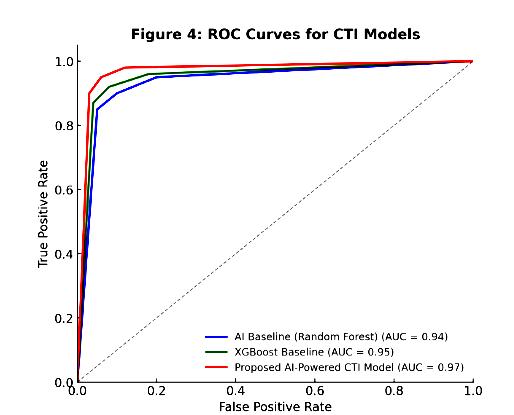 AbarchartcomparingAccuracy,Precision,Recall,andF1ScoreamongtheTraditionalRule-BasedSystem,AIBaseline (RandomForest),andProposedAI-PoweredCTIModel. Figure4.ROCCurvesforCTIModels