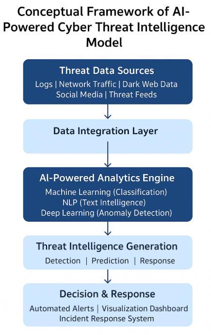 TheproposedAI-poweredCTIframeworkunifiesmultiple datastreamsfromdiversecybersecuritysourcesandapplies AI/ML algorithms to detect,classify,and predict malicious behavior.Themodel’sdesignensuresscalability,real-time adaptability, and automated decision-making for organizationalsecurityinfrastructures.