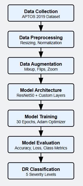 The APTOS 2019 Blindness Detection dataset provides the retinal fundus images for data acquisition at the beginning of the process. The preprocessing phase appliesauniformimagedimensionof224×224pixelsto each image for proper implementation with ResNet50 model inputs. In the next step Normalization applies mathematicalprocessingthroughpixelvaluescalinginto the [0,1] range both for stability improvements and trainingacceleration.