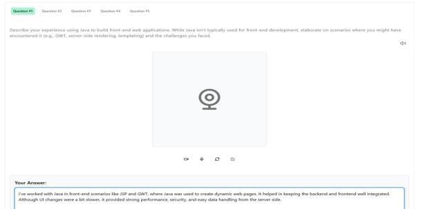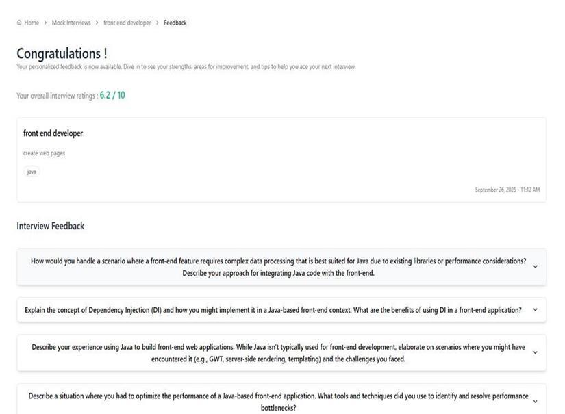 Userscansuccessfullylogin,choosearole,respondtoAIgeneratedquestions,andgetimmediatefeedbackusingthe developed platform. Participant confidence and readiness increased, according to user testing. The scalable Firebase backendallowedthesystemtosupportnumerousconcurrent users without experiencing any performance issues. Early adopters'commentshighlightedthevalueofthecustomized feedbackandrole-specificquestionsets.Foramorerealistic experience, some users recommended extra features like voice-based responses and video recording. Overall, the findingssupporttheplatform'sdesigndecisionsandshow that it has the potential to be a useful tool for career development.Futureplatformimprovementsanditerations willbeguidedbythesefindings