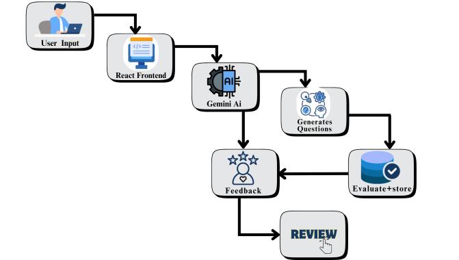 useraseamlessexperience.ReactandHTML/CSSareutilized atthefront-endtocreateauserinterfacethatisresponsive andeasytouse.Strongtypingandcodebasemaintenanceare made possible by TypeScript. Firebase manages databases andauthentication,guaranteeingsafeuserdataretrievaland storage.Thefeedbackandquestion-generationmodulesare poweredbyGeminiAI,whichcustomizescontentbasedon theroletheuserhasselected.Theclientapplicationinteracts withthebackendservicesthroughsecureAPIsinthisclientserverarchitecture. RESTfulendpointsallowdata tomove between components with ease. Additionally, cloud-based deployment is used by the system to guarantee scalability andhighavailability.SensitivedataencryptionandFirebase authentication are used to guarantee security. The system architectureisessentiallydesignedtosupportmultipleusers atoncewithminimallatencyandmaximumdependability.
