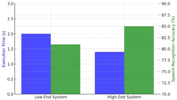 The bar chart illustrates the differences in execution time andspeechrecognitionaccuracybetweenalow-endanda high-endsystem.Executiontime(inseconds)isrepresented by blue bars, while speech recognition accuracy (in
