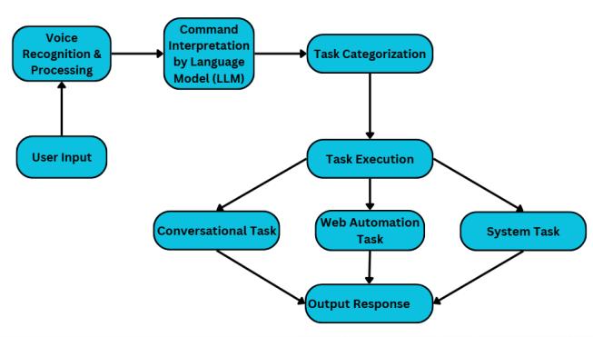 This step-by-step process ensures an efficient and scalable solution for performing automation tasks, respondingtouserqueries,andprovidinga seamlessuser experience.TheproposedmethodologyfordevelopingtheAI assistantfollowsastructuredworkflowthatintegratesvoice recognition, automation, and advanced conversational capabilities,enablingittohandleadiversesetoftaskswith accuracy and efficiency. The system begins with voice command recognition, where Google Speech Recognition processestheuser'sinput,convertingspokencommandsinto text.Thistextisthenparsedtoidentifytheintentandextract relevant keywords for task execution. For automation, pyautogui is employed to interact with web browsers and system interfaces. Specific commands, such as controlling YouTubeplaybackornavigatingGoogleChrome,aremapped toautomatedscriptsthatmimichumanactionslikemouse clicks and keyboard inputs. These automated processes ensure precise execution ofcommands while reducing the needformanual intervention.Additionally,system-related tasks,suchascheckingbatterystatusorrestartingthePC,are handled through native system calls and API integrations, ensuringseamlessfunctionality.Theintelligentinteraction capability of the assistant is powered by a large language model(LLM)integratedthroughtheg4f.pylibrary.ThisLLM processes the parsed input and generates context-aware responsesorsolutions.Forinstance,theassistantcanwrite Python code snippets or provide detailed answers to user queriesbyleveragingtheLLM'sadvancednaturallanguage processingcapabilities.Theinteractionbetweenthespeech recognitioncomponent,automationscripts,andLLMensures a cohesive workflow that balances functionality and intelligence.