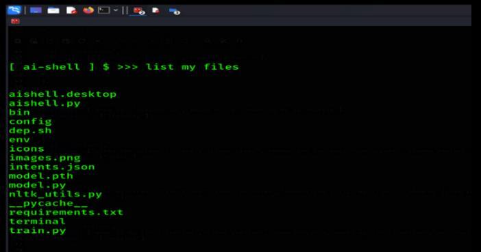 The Command Execution Phase begins after the user’s intent has been successfully identified. In this phase, the system maps the predicted intent to a corresponding predefinedshellcommandandexecutesitusingPython’s system interface. The system supports a wide variety of commands,suchaslstolistfiles,pwdtoshowthepresent working directory, neofetch to display system information, ifconfig to check network configurations, curlwttr.intofetchreal-timeweatherupdates,andcalto displaythecalendar.Theexecutionisdoneautomatically, and the results are displayed to the user through the command-line interface. This phase eliminates the need for the user to know the actual shell command. It increasesefficiencyandconveniencebyautomatingtasks and simplifying the interaction process. Even complex or multi-step commands can be executed with a single natural language input, making the shell environment muchmorepowerfulanduser-centric.