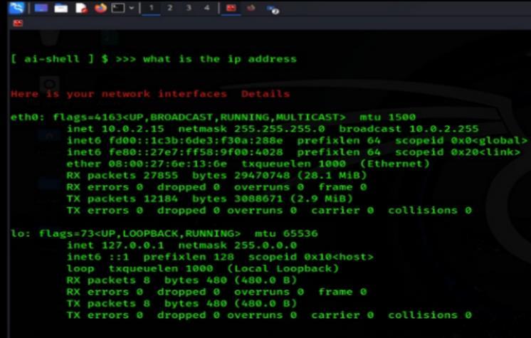 The user requests the system's network configuration usingnaturallanguage.Theshellaccuratelyinterpretsand executesthehi.