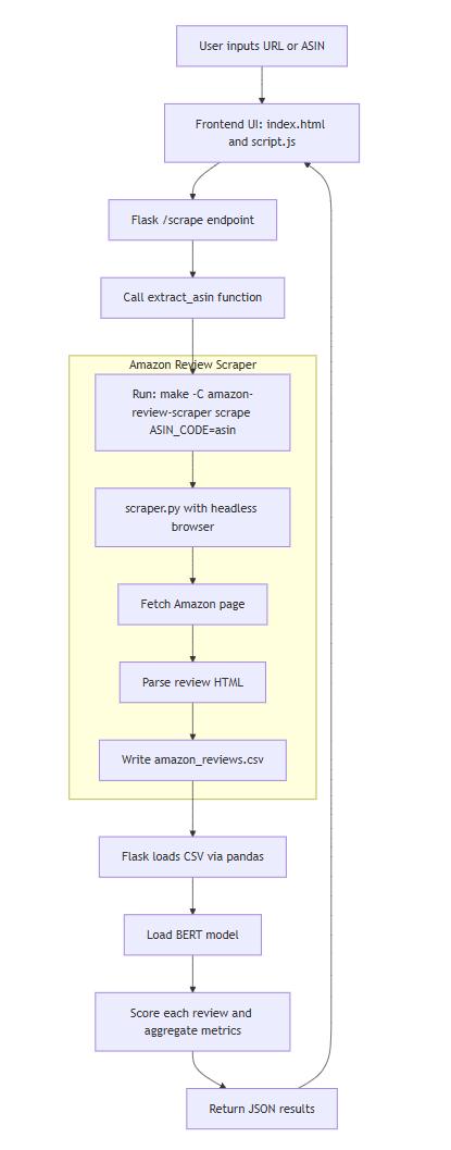 ThisresearchpresentsanAI-drivensystemthatintegrates web scraping and BERT-based classification to detect potential scams on e-commerce platforms, using Amazon as a case study. The prototype demonstrates how natural language processing can be effectively applied to product reviews for legitimacy scoring, providing end users with actionable insights before making a purchase. The system’s modular architecture comprising a Selenium-based review scraper, a fine-tuned BERT model, and a Flask web