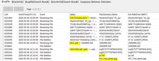 Itwasobservedthatthesetwofilesdidnotundergoanyrenamingpriortodeletionbythefilenuketoolcomparedto other file wiping tools Instead, they were directly deleted without any modification to their original filenames. The original filenamescould be retrieved fromthe$Log File byanalyzingthetransactional records,however nospecific metadatawasfoundwithinthe$LogFileentriestosuggestthatthesefileshadbeensubjectedtoa filewipingprocess. Asaresult,whilethedeletedfileswereidentifiable,theirdeletionappearedsimilartonormalfiledeletionratherthan antiforensicwipingactivities.