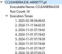 From a forensic standpoint, the Last Execution Time is critical for establishing temporal evidence it shows when a particularapplicationwasused.Thisisespeciallyusefulwheninvestigatingmalwareactivity,unauthorizedaccess,or the use of anti-forensic tools. For instance, if a wiping tool was last executed just before key files disappeared, it strongly suggests intentional data destruction. Additionally, this timestamp can be cross-referenced with other artifacts such as event logs, $MFT entries, or user login sessions to corroborate timelines and attribute activity to specificusers.InWindows8andabove,prefetchfilesalsostoremultiplepastexecutiontimes.