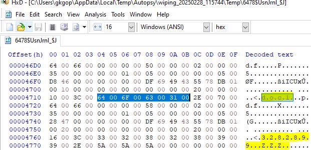 Ananalysisofthe$UsnJrnlrevealedthatwipedfilescouldbeidentifiedthroughdistinctivefile-renamepatterns.TheUSN Journal($UsnJrnl)isasystemfileusedbytheNTFSfilesysteminWindowstologchangesmadetofilesanddirectoriesona volume.The$UsnJrnlfileconsistsmainlyof two data streams, i.e., $Max and $J. Each record in the $J stream logs actions suchasfilecreation,modification,deletion,andrenaming,alongwithassociatedmetadataliketimestamps,reasoncodes, andfilenames.WiththehelpoftheNTFSlogtrackerv1.8tool,wewereabletoidentifythatthefileswipedusingtheFile shredder tool were renamed to a format such as 1278654.ZZZ.Also, by checking the $UsnJrnl files, we could see the originalfilenamesaswellastheirrenamedfilenames.Therefore,wewereabletoidentifyapatternforfilewipingdoneby the file shredder tool. From the $UsnJrnl structure, we can identify the reasonflags, which indicate the renaming of the files.0x1000 = RENAME OLD NAME: Indicates the file was renamed from this name. 0x2000 = RENAME NEW NAME: Indicatesthefilewasrenamedtothisname.