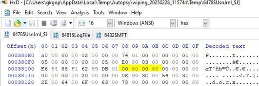 Foranormalfile,this0x8000flagtypicallyappearsonceduringregularattributeortimestampupdates.However,fortime stomped files, this flag tends to appear multiple times in the journal records for that file. This repeated presence of the 0x8000 flag for a single file is an anomaly and raises suspicion of time stomping. If a timestamp mismatch is found betweentheSIandFNattributesforthosefilesthathavemultiple0x8000flagsin $UsnJrnl,itprovidesstrongevidenceof timestamp manipulation. By identifying files that have the 0x8000 reason flag occurring multiple times in $UsnJrnl and thencomparingtheirSIandFNtimestampsfromthe$MFT,investigatorscandetecttime stompingwithhigh confidence. This method is effective even if other forensic artifacts (like Prefetch or event logs) have been cleared, making it a powerfulanti-anti-forensicstechnique.