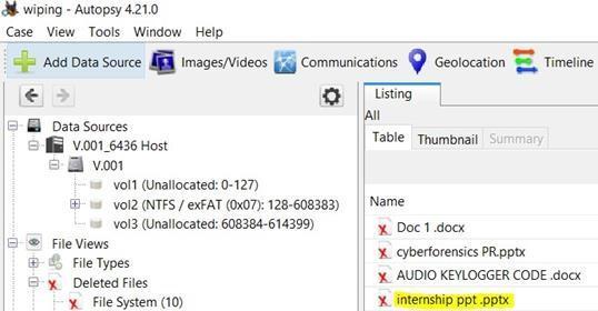 - Duringtheanalysisofthedeletedfileslist,onlythe”Internship PPT.pptx”filewasidentified- previouslywipedusing the WipeFile tool. This observation suggests that files erased with WipeFile can still be recovered, atleastpartially, usingforensictoolssuchasAutopsy.ThelistofdeletedfilestakenfromAutopsysoftwareisshowninFig7.However,it isimportant to notethatAutopsywasonlyabletorecognizethefileaspermanently deleted;nospecific metadata or indicatorswerefoundtosuggestthatthefilehadundergoneadeliberatewipingprocess.