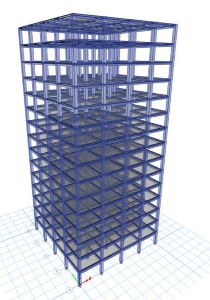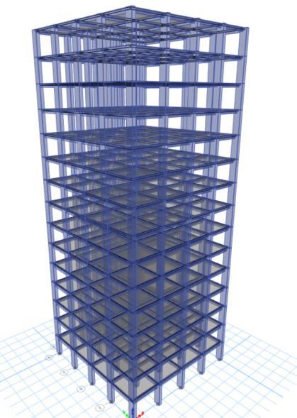 The ETABS model consists of a 15-storey reinforced concretemoment-resistingframebuildingwithasoftstorey at ground floor. Floor to Floor height is 3m, columns are modeled as 450mmx450mm sections and beams as 300mmx450mmsections DLandLLloadsareappliedasper IS875(Part1&2),andseismicloadsareassignedaccording to IS 1893 (Part 1) for seismic zone IV. Both static and Dynamicanalyses(ResponseSpectrum)areconducted.The base is considered as Rigid, and slabs are modeled as membraneelements.