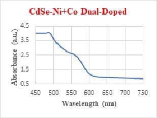 The cubic phases of CdSe, Ni and Co exist, JCPDS card No (00-019-019) information for CdSe, Ni and Co selenide wasusedtodeterminethesamplephase.TheXRDpattern suggests a poly-crystalline structure, all the films demonstrate three dominant peaks at 25.55°, 42.17° and 50.67° belonging to (111), (220) and (311) planes for undopedCdSeand25.51°,42.39°and50.22°areNi-CoCodoped CdSe respectively, with doping peaks increased slightly.