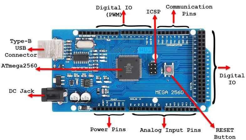 Thedeviceisequippedwith54digitalinput/output pins,14ofwhicharecapableoffunctioningasPWMoutputs. Additionally, it features 16 analog inputs, 4 UARTs (hardwareserialports),a16MHzcrystaloscillator,aUSB connection,apowerjack,anICSPheader,andaresetbutton.