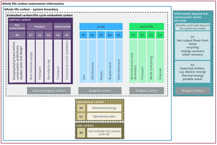 Fig-3: Buildingandinfrastructurelifecyclestagesand informationmodules(adaptedfromEN15978,EN17472 andEN15643,withadditionstoillustratebiogenic carbon);Source:RICSWLCA-2ndEdition[6].