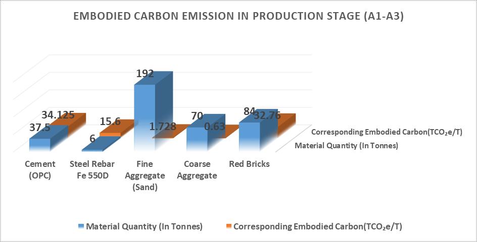 InIndia,asignificantportionofthepopulationbelongsto the middle-class bracket. Within this demographic, the expectations for residential construction among average middle-incomehouseholdsprioritizemaximizingavailable space, minimizing construction expenses, procuring standard-qualitymaterialsataffordableprices,andensuring structuraldurabilitywithoutcompromise.However,thereis limited awareness regarding the substantial carbon emissions associated with various stages of a building's lifecycle.Unfortunately,thisaspecthasreceivedverylittle attention thus far. To address this knowledge gap and increase awareness, this study adopts a framework published bytheRoyal Institution ofChartered Surveyors (RICS) to assess the CO₂ emission (Embodied Carbon) of buildingfor4keymaterials-cement,steel,aggregates(fine and coarse) and solid red bricks from product stage to constructionprocessstageofthebuilding.