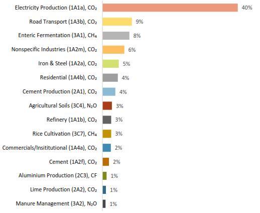 According to India's Biennial Update Report (BUR 3)2021, the iron and steel sector (1A2a), CO₂ contributed to 5%,whilethecementproduction(2A1),CO₂accountedfor 4% and electricity production (1A1a) CO₂ was the single largestsourceinthiscategory,accountingforabout40%of the national total GHG emissions in 2016 [2]. The other sectors, together contributed about 10% to energy sector emissionswithapproximately60%sharecomingfromthe residential sector (1A4b) CO₂ [2]. The manufacturing