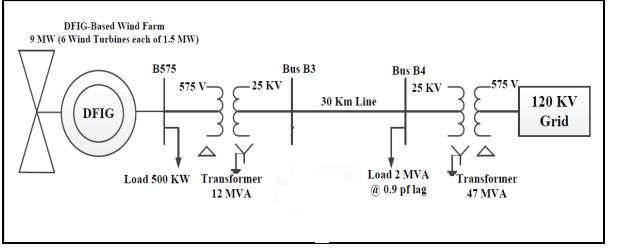 The single line diagram of the test system used for the MATLABsimulationisshowninfigure3.MATLAB/SIMULINK isusedfortheanalysis.Thegridmodel[Americansystem] consists of a 120kV, 60Hz grid supply point, feeding the supply to 25 kV distribution system through a step down transformer of 120-25kV, 47MVA, another 25kV-575V, 12MVAstep-downtransformerconnectedbetweengridand busB4toagainstepdownthevoltageatthelevel575