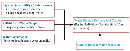 The figure illustrates a framework for assessing water supplyaccessibilityandservicedelivery.Ithighlightsthree key components that influence water service outcomes: physical accessibilityofwatersources, reliabilityof water supply, and water governance. Physical accessibility considersthedistancetowatersourcesandthetimespent collectingwater,whilereliabilityfocusesonthefrequency and availability of water. Water governance emphasizes participation, fairness, and accountability. These three factorscollectivelyimpacttheoverallwaterservicedelivery outcomes, including equity, reliability, sustainability, and usersatisfaction.Additionally,theframeworkrecognizesthe role of gender in water collection, indicating that gender dynamics can affect water service outcomes. Women and girls often bear the primary responsibility for collecting water, which can influence both the time spent accessing water and their ability to participate in governance. By incorporating gender considerations, the framework underscores the importance of equitable and inclusive approaches to water management, ensuring that services meettheneedsofalluserseffectively