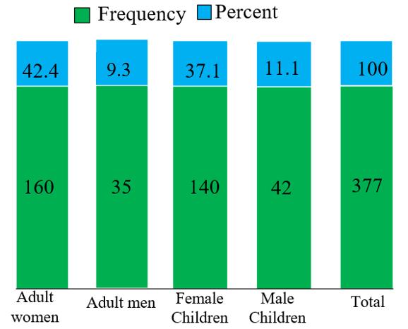 The analysis of household water collection responsibilities in Haro Sebu Town reveals a highly gendered pattern (Fig. 5). Adult women constitute the largest group of primary water collectors, responsible for 160households(42.4%),followedbyfemalechildrenat140 households (37.1%). Collectively, women and girls are responsiblefor300households(79.5%)ofwatercollection activities. Adult men (35 households, 9.3%) and male children(42households,11.1%)contributeminimally.The high involvement of female children indicates that water collection duties may interfere with schooling and educationalperformance.Thesefindingsareconsistentwith studies conducted in other Ethiopian regions, such as Oromia, Amhara, and Tigray, which also report a