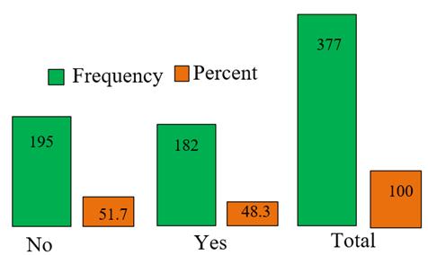 Household participation in local water governance structures, such as community meetings, water user committees,andconsultations,remainsrelativelylimitedin HaroSebuTown(Fig7).Outof377householdssurveyed, 182 households (48.3%) reported being involved in governance processes, while 195 households (51.7%) indicated no participation at all. This suggests that nearly half of the population is excluded from decision-making platforms that influence water allocation, tariff setting, serviceimprovements,andcomplainthandling.