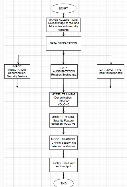 The proposed system operates through a series of welldefined stages, combining computer vision and deep learning techniques to ensure precise detection and classificationofIndiancurrencynotes.Eachstageplaysa critical role in transforming raw input into actionable insights.
