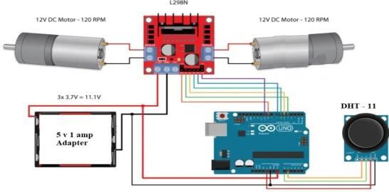 robotic platforms, and smart mobility solutions. The system combines real-time obstacle detection, motor control, and environmental monitoring to ensure efficientoperation.Itispoweredbyadual-sourcesetup, where a 5V 1A adapter supplies power to the Arduino Uno,whilean11.1Vbatterypack(3x3.7VLi-ion)powers the L298N motor driver and two 12V DC motors (120 RPM). The Arduino processes input signals and sends commands to the motor driver to regulate motor speed and direction. Sensor data acquisition is facilitated by a DHT-11 sensor, which monitors temperature and humidity, triggering automated responses such as activatingablowerwhenhumiditylevelsrise.Userinput ishandledviaajoystickmodule,allowingmanualcontrol by sending directional and speed commands to the Arduino. The system can operate autonomously by processing real-time data from sensors or switch to manual mode via joystick input. An ultrasonic sensor is integrated for obstacle detection, ensuring safety by triggeringanemergencybrakingmechanismifanobject is detected within a predefined range. Additionally, the Arduino continuously monitors sensor inputs and can send real-time alerts based on specific conditions, such as activating a blower to improve visibility in response to high humidity levels. This comprehensive integration of automation, safety, and environmental sensing enhancestheefficiencyandreliabilityofthesystem.