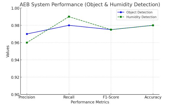 The Automatic Emergency Braking (AEB) system demonstrates a high accuracy of 98%, ensuring reliable detection of obstacles and humidity variations. The precision and recall values indicate that the system effectively minimizes false activations while ensuring necessaryactionsaretakenwhenrequired.ThehighF1scores confirm a well-balanced between precision and recallinvariousscenarios. Withsupportvaluesshowing a diverse test set, the system has been rigorously evaluated, proving its robustness. The results validate that the AEB system can be trusted for real-time applications, ensuring safety and efficiency in varied environmentalconditions.