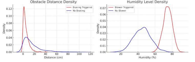 system equipped with obstacle detection and environmental sensing. The Obstacle Distance Density graph(left)illustrateshowbrakingistriggeredbasedon obstacle proximity. The red curve represents instances wherebrakingwasactivated,primarilyoccurringatvery short distances (0-10 cm), indicating that the system responds immediately when an obstacle is detected within a critical range. In contrast, the blue curve, representing cases where no braking was needed, is more spread out across greater distances, showing that thevehiclecontinuesmovingwhennoimmediatethreat is present. This ensures efficient collision avoidance withoutunnecessarybraking.