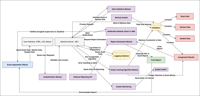 The system's architecture integrates several components: data input, validation, processing, storage, and report generation. These elements work together to provide a unified interface for exam officials and students. The user interface, designed with HTML, CSS, and Blazor, offers a simple and secure platform for entering exam schedules, teacheravailability,andstudentdetails,ensuringaccessis restrictedtoauthorizedusers.