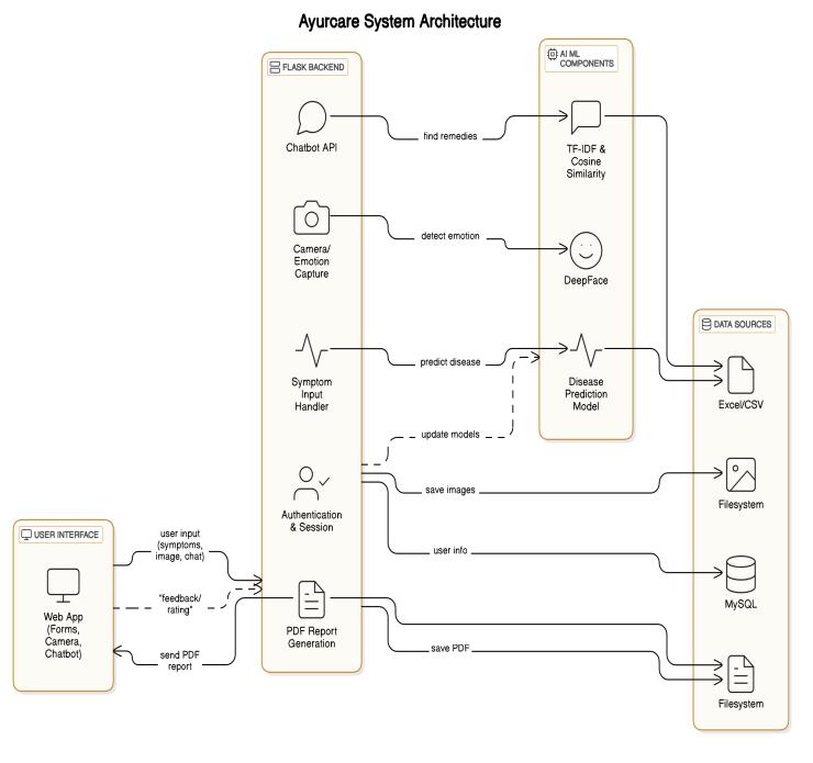 The development of Ayurcare: AI-Driven Ayurveda Prescriptionand Health Insight System isstructuredaround amulti-layeredarchitecturedesignedtofacilitateseamless interaction between users, AI-driven predictive engines, andtheintegratedhealthcarechatbot.