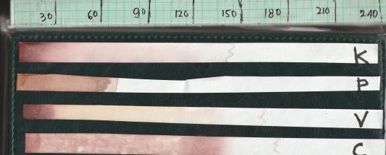 Fig-4; DriedstripesofChromatograph,showingwithmeasuringscaleinmillimeter,Observecolor-ch4oma pigmentedonthestripanddifferentiateminutelyeachone. VatalevelisabovethanControlandPittaislowestand Kaphaisinmiddlelevel.InVataandKaphastripesthreelevelsareseen,whileinPittatwolevels.