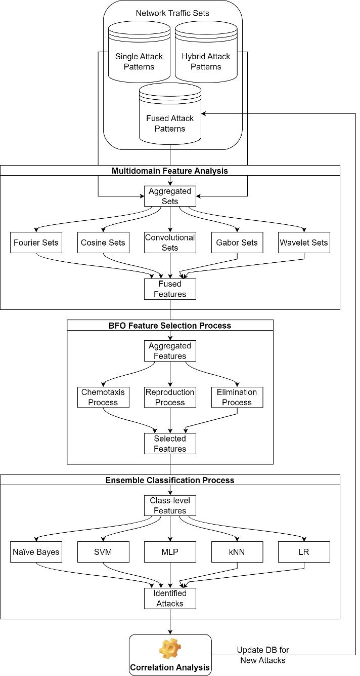 extract multidomain features. These capabilities perform frequencyanalysis,energyanalysis,window-basedanalysis, andspatio-temporalanalysis,whichaidsinidentifyingtraffic patternsforspecificattacktypes.Thesetrafficpatternsare processedbyaBacterialForagingOptimizer(BFO),which aidsintheidentificationofattack-specificfeaturesetswith high density. The identified features are classified using a combination of ensembles of weak classifiers whose performance is enhanced through boosting operations. These classifiers consist of Nave Bayes (NB), Multilayer Perceptron (MLP), k Nearest Neighbours (kNN), Support VectorMachine(SVM),andLogicalRegression(LR),allowing themodeltoidentifydynamicnetworkattacks.