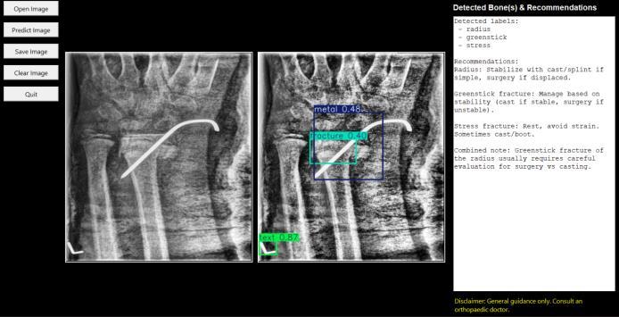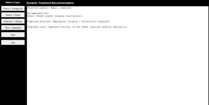 fractureandtheboneinvolved.Basedonthisclassification, the system generates a treatment recommendation by referringtoamedicalknowledgebasecontainingstandard guidelines. For instance, a simple transverse fracture may require immobilization using a cast, while a compound fracturemayneedsurgicalintervention.Thesystemdisplays these recommendations in the graphical interface for user reference. A medical disclaimer is also included, clearly stating that these recommendations are for guidance only andthatusersmustconsultahealthcareprofessionalforfinal diagnosisandtreatment.TheGUIprovidesasimpleinterface to display the processed X-ray image with the detected fracture, classification details, and recommended treatmentoptions.