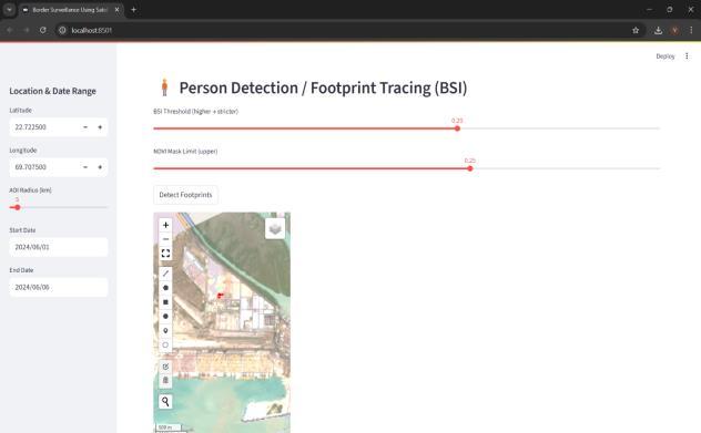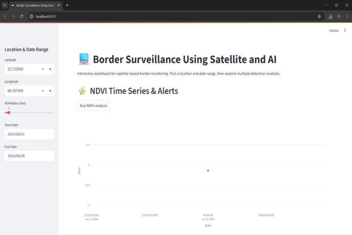Abstract - Border surveillance has become a critical national security requirement due to increasing concerns regarding illegal migration, unauthorized crossings, smuggling, and strategic threats. This research proposes a satellite-based, artificial intelligence-driven surveillance system capable of continuously monitoring border regions using multi-temporal remote sensing data. The system integrates Google Earth Engine with intelligent modules for vegetationchangeanalysis(NDVI),movementtracking,object detection (vehicles, buildings, and cargo containers), human footprint tracing, andpredictive analytics for smugglingand migrationrisks. The proposedsolutionautomates geospatial analysis through indices (NDVI, NDBI, NDWI, BSI), SAR backscatter, and temporal differencing. A Stream lit-based dashboard provides real-time analysis, alerts, and risk visualization for border forces. The system is lightweight, scalable, and low-cost, making it suitable for large border surveillance operations. Experimental evaluation shows significant potential for real-time border monitoring, early anomaly identification, and predictive security analytics.